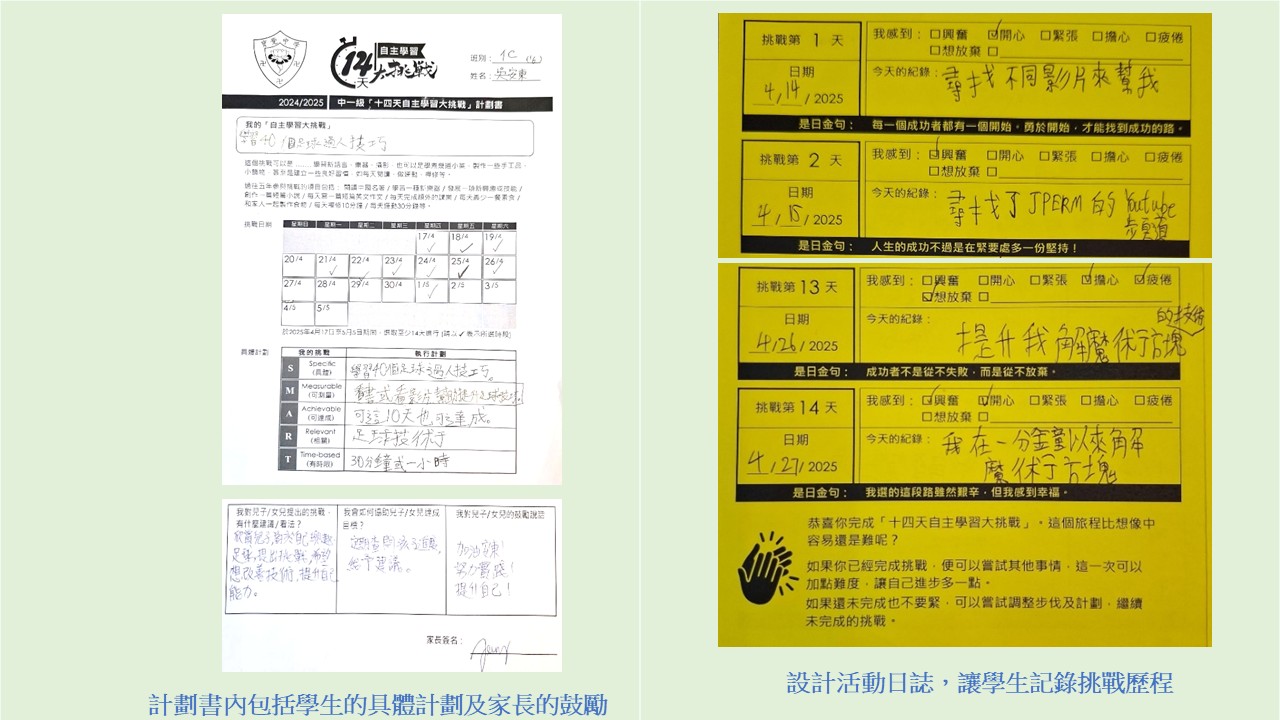本計劃深受學生喜愛,挑戰內容豐富多元,涵蓋學習新語言、樂器、閱讀名著,到創作動漫、禪修、每日運動,甚至破解魔方、練習左手寫字等,充分展現學生的熱情與創造力。